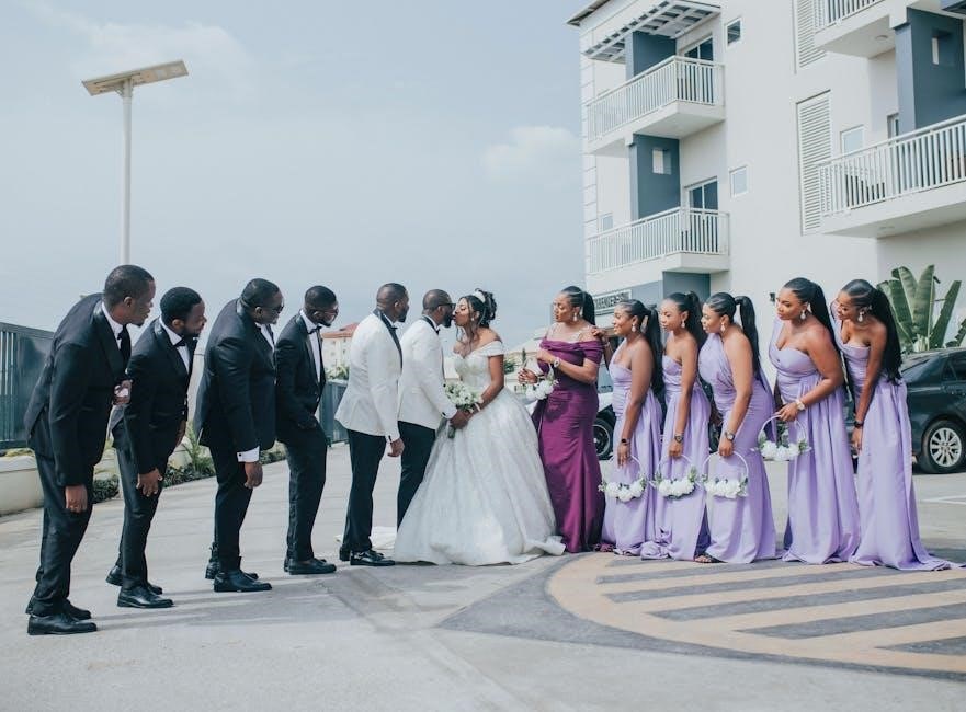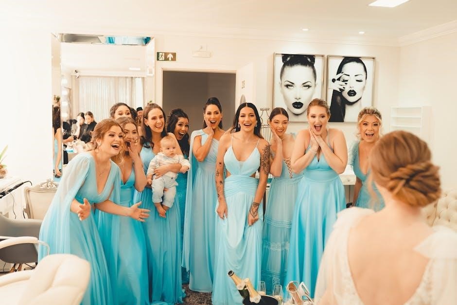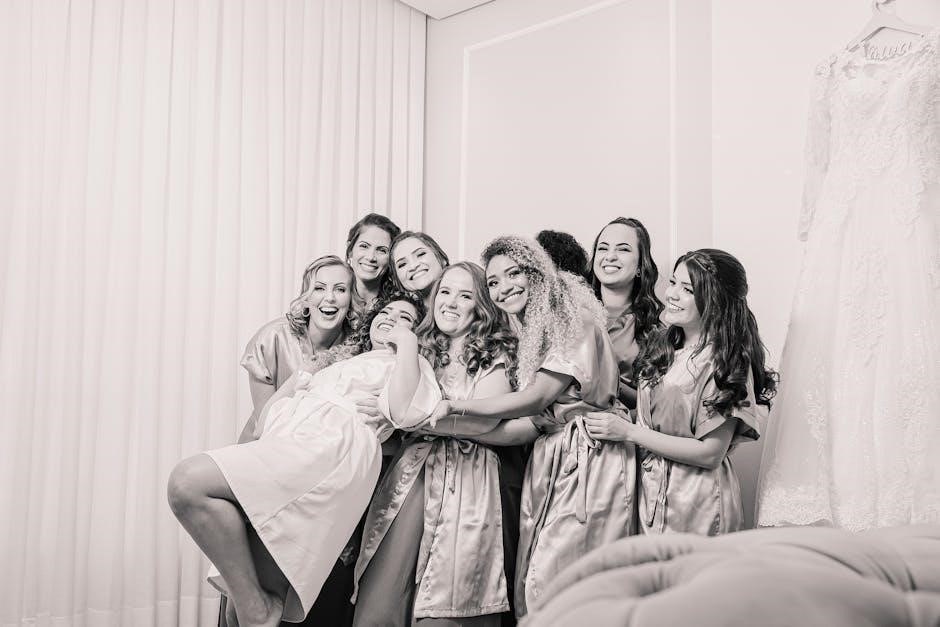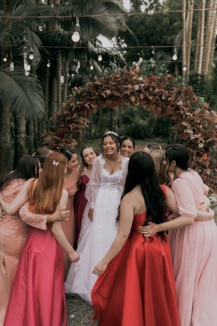A bridesmaid duties checklist PDF ensures seamless support! Tasks include assisting the bride with attire, guiding guests, and maintaining a calm, joyful atmosphere.