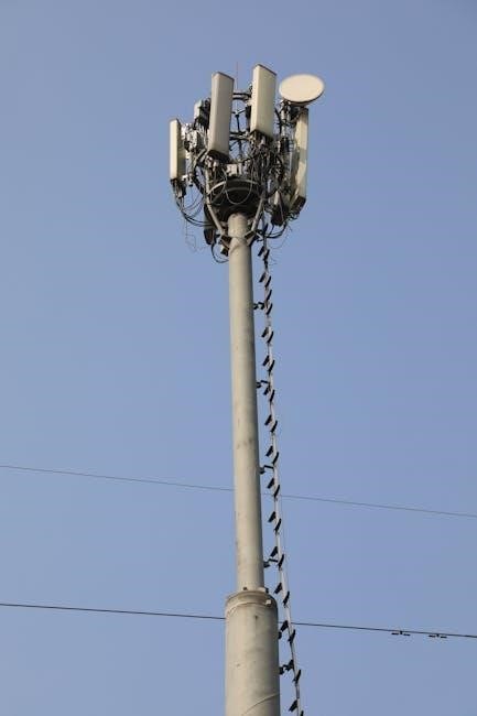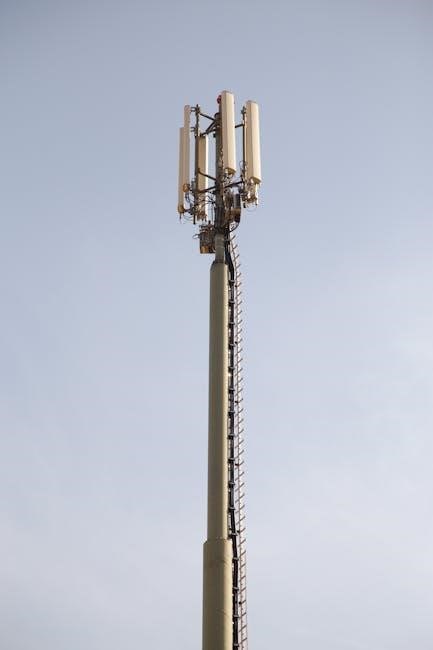 The tower structure is a critical component, providing the framework to support antennas and equipment. Typically constructed from steel or concrete, these towers vary in height and design, ranging from 50 to over 400 feet. Guyed towers use cables for stability, while self-supporting towers rely on their own strength. Monopole towers are single-pillar structures, often preferred for urban areas due to their sleek design. The tower’s height and design are chosen based on signal coverage needs, terrain, and environmental factors. Structural integrity is ensured through rigorous engineering and materials, with foundations deeply anchored to withstand wind and seismic activity. Regular maintenance ensures longevity and safety, making the tower structure vital for reliable communication networks. These structures are adaptable, catering to diverse deployment scenarios while maintaining aesthetic and functional requirements.